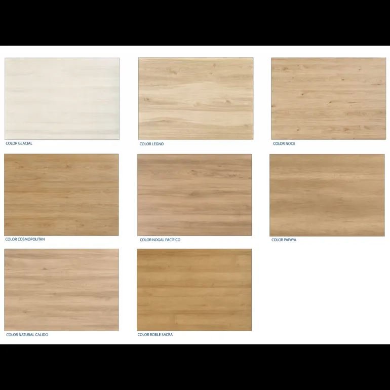 | Acabado | Alba, Balboa, Crack, Glacial, Lacado 01, Lacado 02, Lacado 03, Lacado 04, Lacado 05, Lacado 06, Lacado 07, Lacado 08, Lacado 09, Lacado 10, Lacado 11, Lacado 12, Lacado 13, Lacado 14, Lacado 15, Lacado 16, Mozart, Natural Cálido, Papaya, Roble Sacra, Stone Blanco, Verona, Noce, Roble Natural, Roble Carbón |