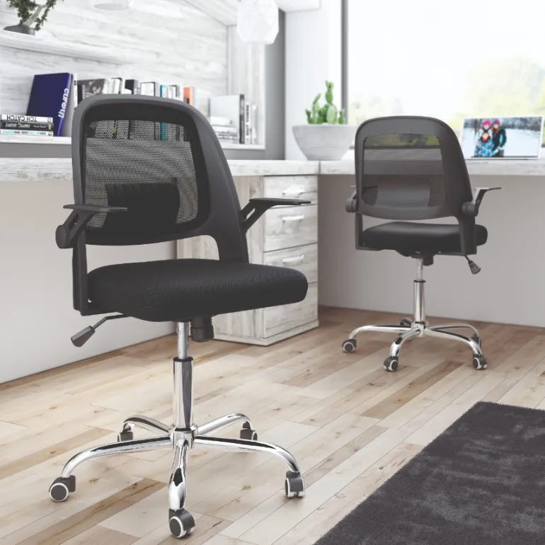 silla de escritorio Kie negra con ruedas muy resistente, con reposabrazos abatibles, estructura negra y asiento tapizado en negro, y patas cromadas. Con un diseño muy actual, de estilo moderno, pero que encaja en cualquier tipo de decoración a la perfección.