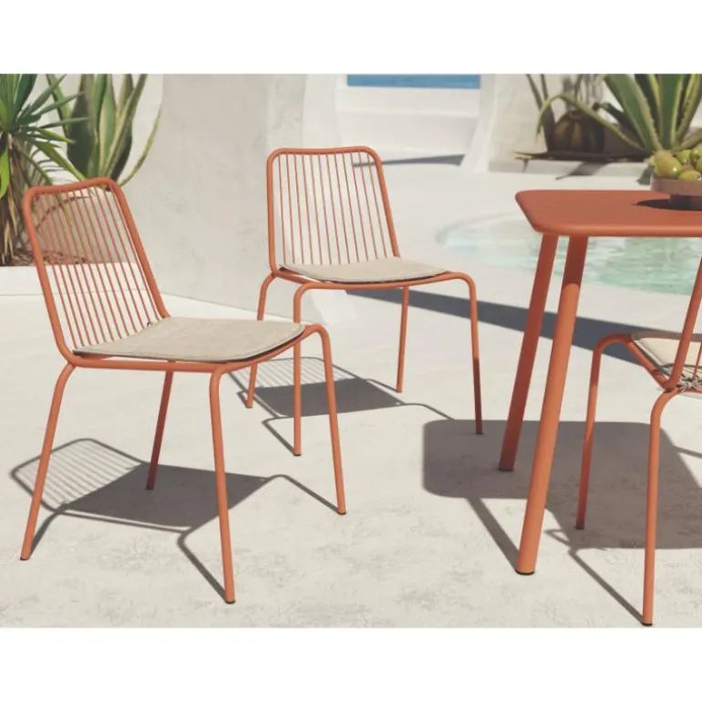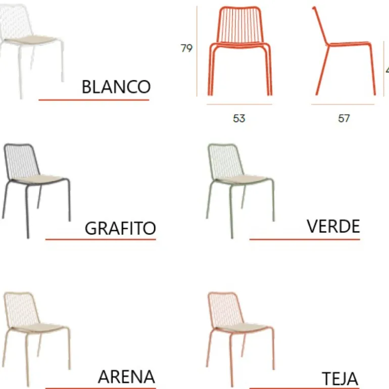 silla de terraza Caribe. Silla de comedor o terraza apilable metálica, con cojín en tapizado beige, muy resistente apta para interior o exterior. Con un diseño muy actual, de estilo moderno, pero que encaja en cualquier tipo de decoración a la perfección. Escoge la combinación que encaje mejor con tu estilo, de las posibles combinaciones diferentes de colores: Teja, Verde, Arena, Blanca y Grafito.