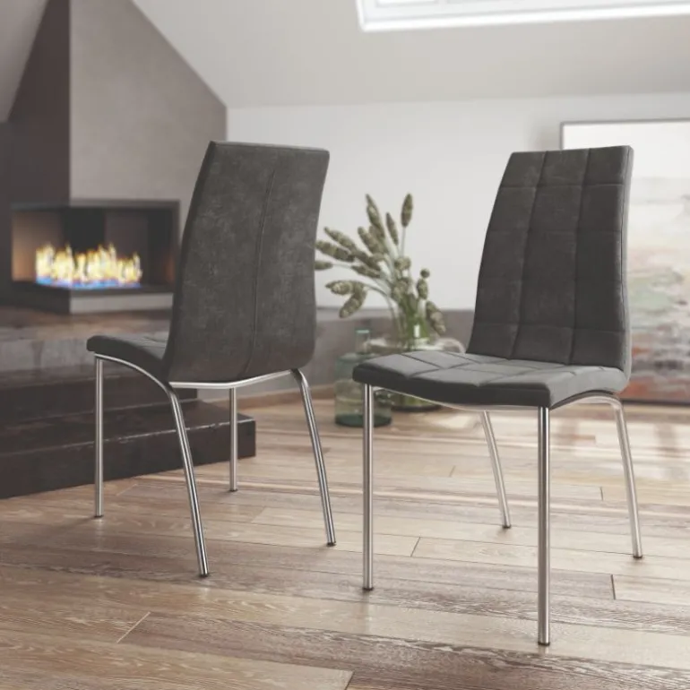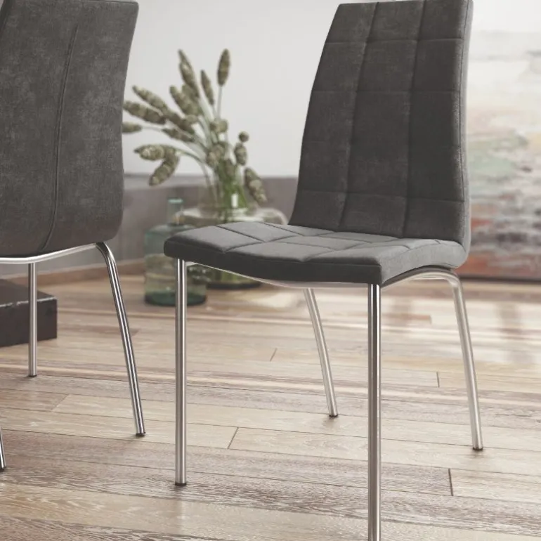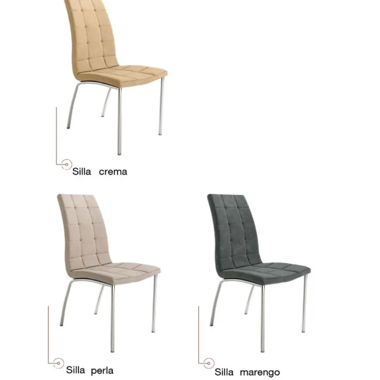 silla Doren cromada. Silla de comedor con asiento y respaldo tapizado y acolchados, estilo capitoné, y respaldo alto, con patas metálicas cromadas muy resistente. Con un diseño muy actual, de estilo moderno – contemporáneo, pero que encaja en cualquier tipo de decoración a la perfección. Escoge la combinación que encaje mejor con tu estilo, de las posibles combinaciones diferentes de colores: Crema, Perla y Marengo.