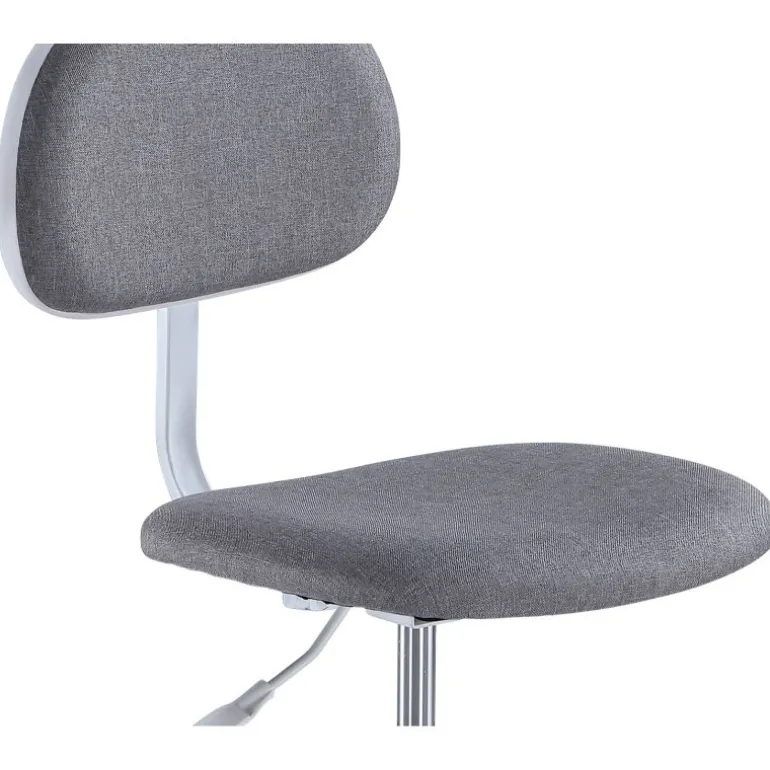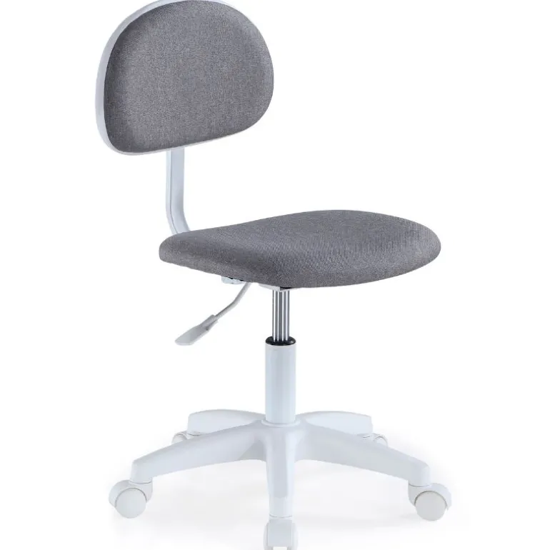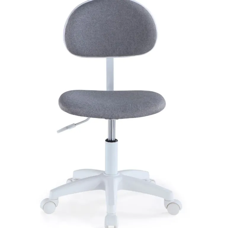 Silla de estudio de formas sencillas, pensada para ofrecer comodidad, con respaldo y asiento acolchado y tapizado en tejido 3D completamente transpirable, en color gris. Estructura y ruedas blancas. Podrás regularla en altura y además es giratoria, con 5 ruedas especiales de goma dura para no dañar el suelo o la superficie donde este ubicada la silla.