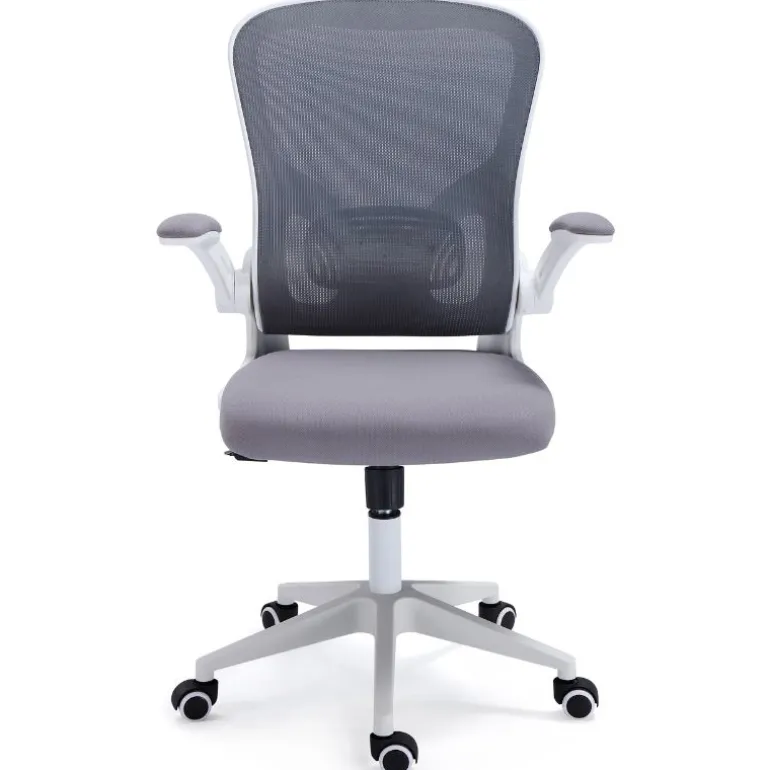 Silla de escritorio con mullido asiento y respaldo tapizados con tejido 3D completamente transpirable. Tienerefuerzo lumbar para una mejor postura, color gris. Estructura, con 5 ruedas especiales de goma dura para no dañar el suelo o la superficie donde este ubicada la silla, y brazos en color blanco.