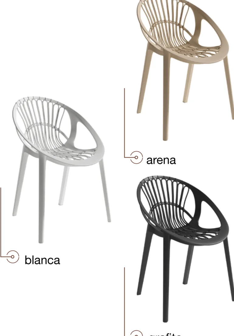 Silladecomedor o terraza redonda apilable de polipropileno, muy resistente apta para interior o exterior. Con un diseño muy actual, de estilo moderno, pero que encaja en cualquier tipo de decoración a la perfección. Escoge la combinación que encaje mejor con tu estilo, de las posibles combinacionesdiferentes de colores:Arena, Blanca o Grafito.