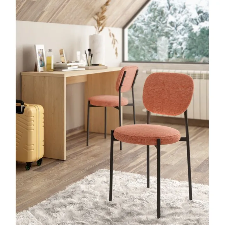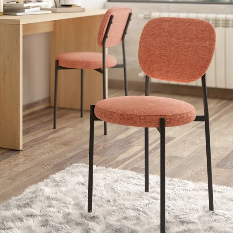 silla Hubert. Silla de comedor con asiento y respaldo tapizado y acolchado, patas metálicas negras muy resistente. Con un diseño muy actual, de estilo moderno – contemporáneo, pero que encaja en cualquier tipo de decoración a la perfección. Escoge la combinación que encaje mejor con tu estilo, de las posibles combinaciones diferentes de colores: Verde, Salmón, Mostaza, Azul.