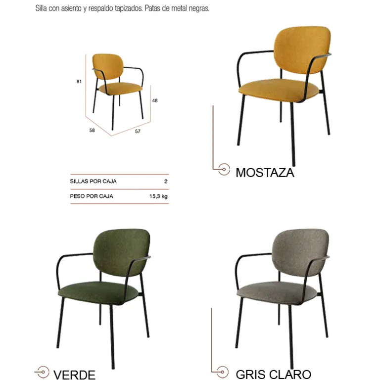 silla Moura. Silla de comedor con asiento y respaldo tapizado y acolchado, que recoge las lumbares, con patas y reposabrazos metálicos negros muy resistente. Con un diseño muy actual, de estilo moderno, pero que encaja en cualquier tipo de decoración a la perfección. Escoge la combinación que encaje mejor con tu estilo, de las posibles combinaciones diferentes de colores: Verde, Mostaza, Gris Claro.