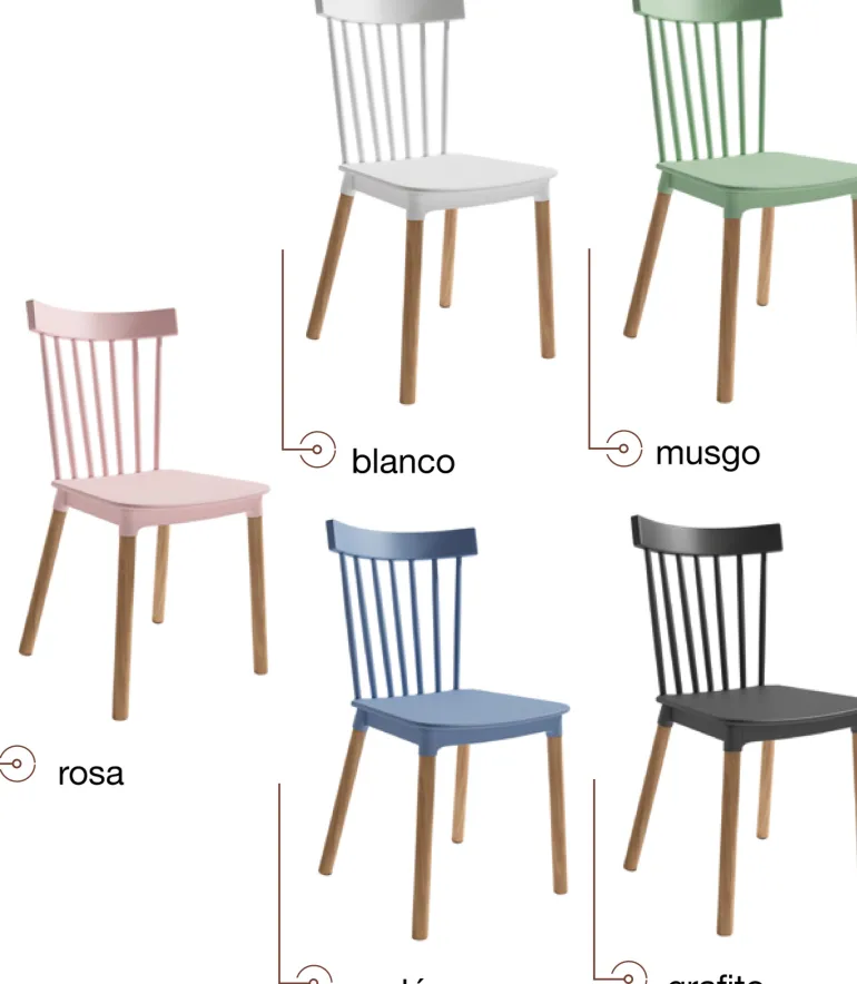 Silladecomedor de polipropileno muy resistente. Con un diseño muy actual, de estilo moderno, pero que encaja en cualquier tipo de decoración a la perfección. Escoge la combinación que encaje mejor con tu estilo, de las posibles combinacionesdiferentes de colores:Blanco, Musgo, Rosa, Azulón o Grafito.