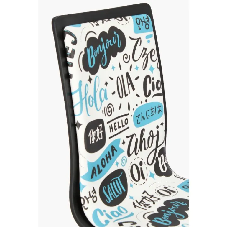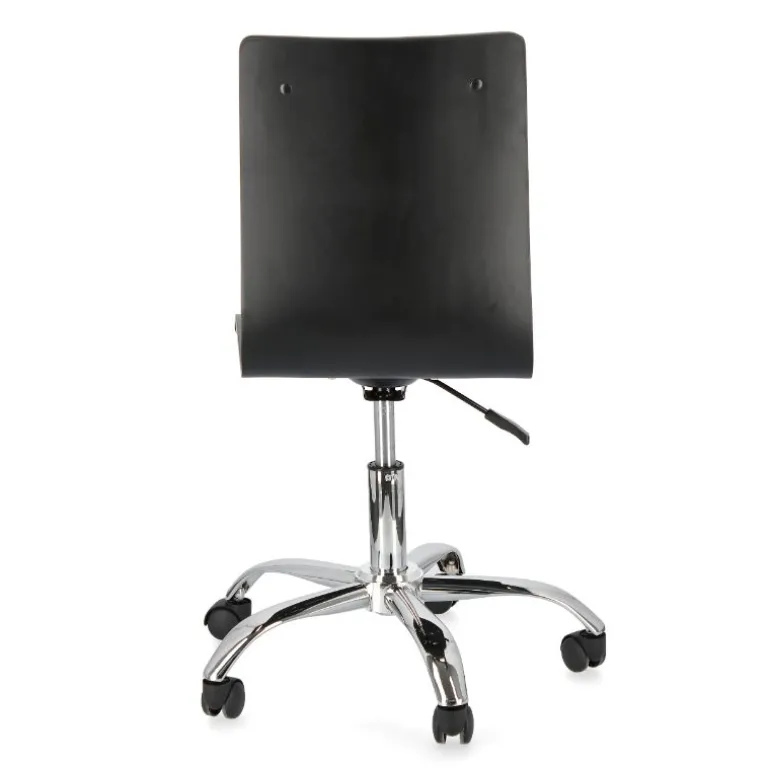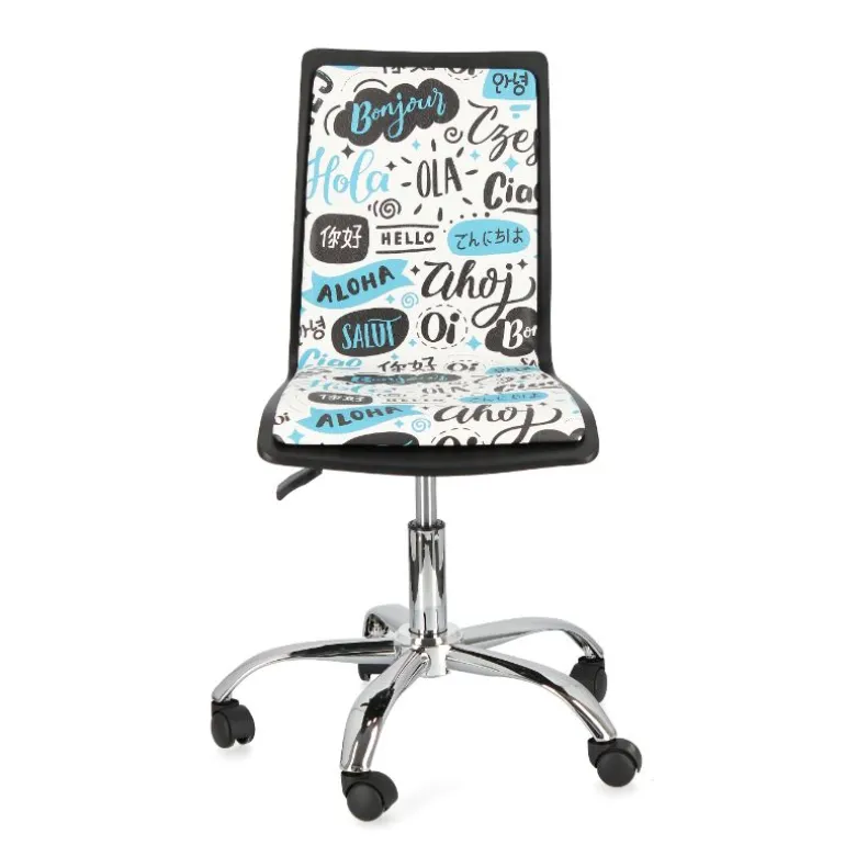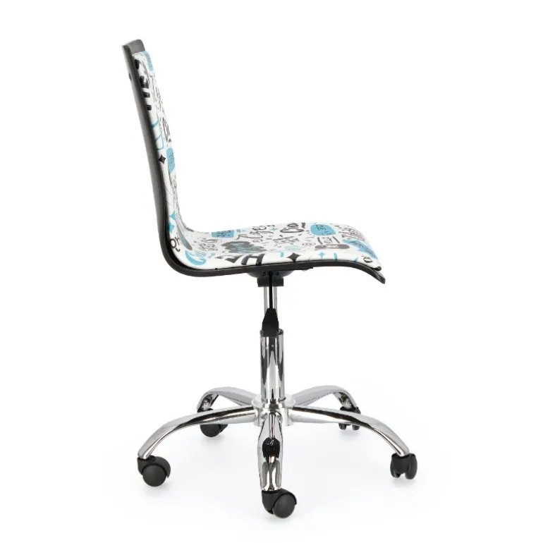 Silla de estudio moderna estilo pop art, asiento de madera tapizado, pie y patas de acero cromado, giratoria con sistema de elevación a gas. Muy cómoda, con asiento tapizado en polipiel. Muy cómoda acolchada con 28kg/m3 de densidad. Dispone de ruedas de plástico de nylon, aptas para parqué que evitan ralladuras.