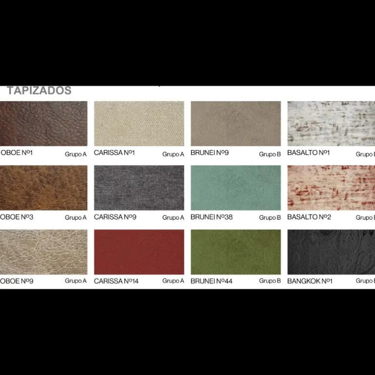 | Tapicería | BANGKOK Nº1, BASALTO Nº1, BASALTO Nº2, BRUNEI Nº38, BRUNEI Nº44, BRUNEI Nº9, CARISSA Nº1, CARISSA Nº14, CARISSA Nº9, OBOE Nº1, OBOE Nº3, OBOE Nº9, Brisa 1, Brisa 10, Brisa 11, Brisa 12, Brisa 13, Brisa 14, Brisa 15, Brisa 17, Brisa 18, Brisa 19, Brisa 2, Brisa 20, Brisa 3, Brisa 4, Brisa 5, Brisa 6, Brisa 7, Brisa 8, Brisa 9, Brisa16, Nido 1, Nido 10, Nido 11, Nido 12, Nido 13, Nido 14, Nido 15, Nido 16, Nido 17, Nido 18, Nido 19, Nido 2, Nido 20, Nido 3, Nido 4, Nido 5, Nido 6, Nido 7, Nido 8, Nido 9 |