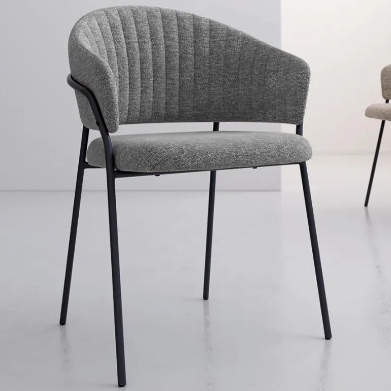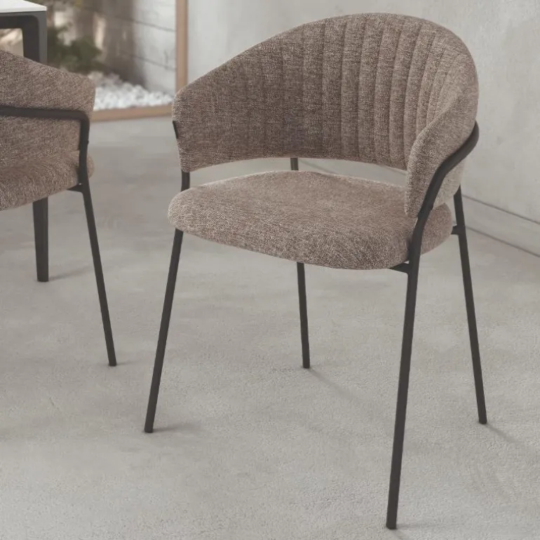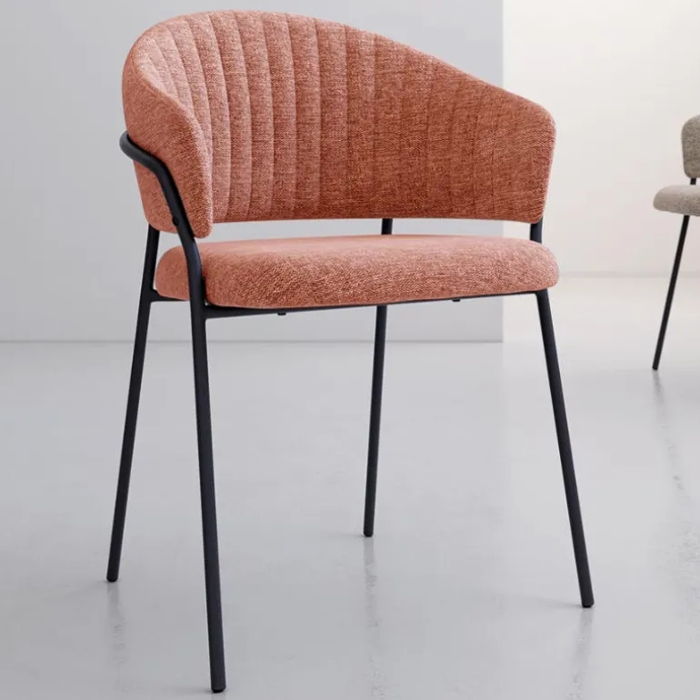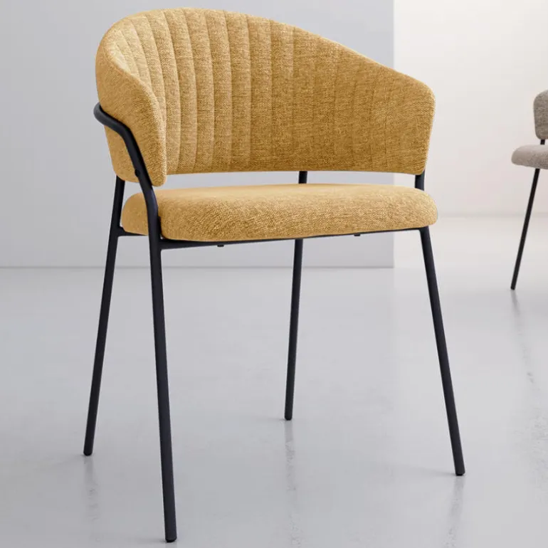 Silladecomedortapizada con reposabrazos alto, patas metálicas negras muy resistente. Con un diseño muy actual, de estilo moderno, pero que encaja en cualquier tipo de decoración a la perfección. Escoge la combinación que encaje mejor con tu estilo, de las posibles combinaciones diferentes de colores: Gris, Gris claro, Marrón, Salmón, Mostaza, Verde.