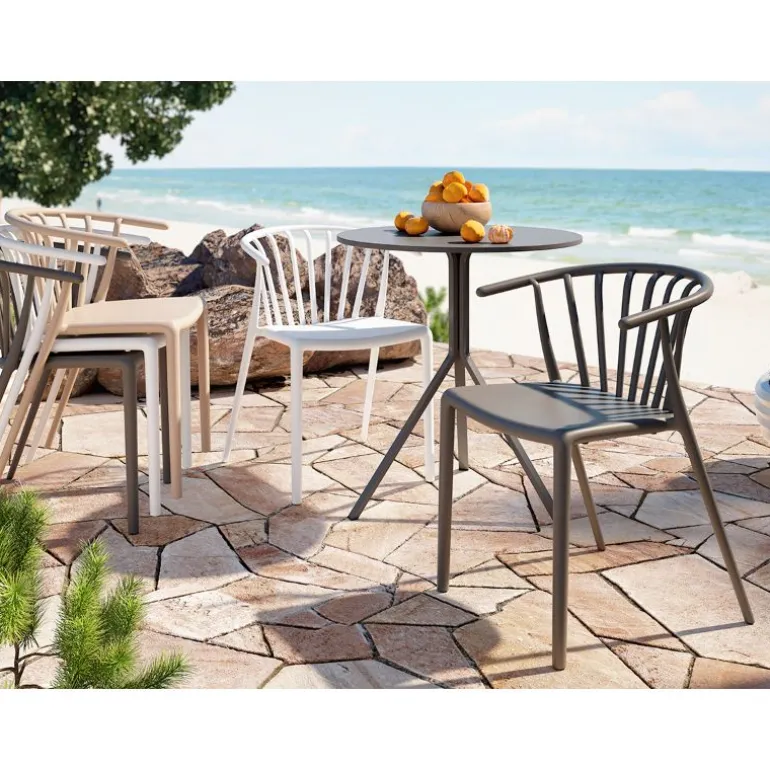 silla Viseu. Silla de comedor o terraza apilable de polipropileno, muy resistente apta para interior o exterior. Con un diseño muy actual, de estilo moderno, pero que encaja en cualquier tipo de decoración a la perfección. Escoge la combinación que encaje mejor con tu estilo, de las posibles combinaciones diferentes de colores: Arena, Blanca y Grafito.