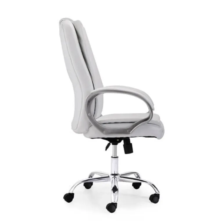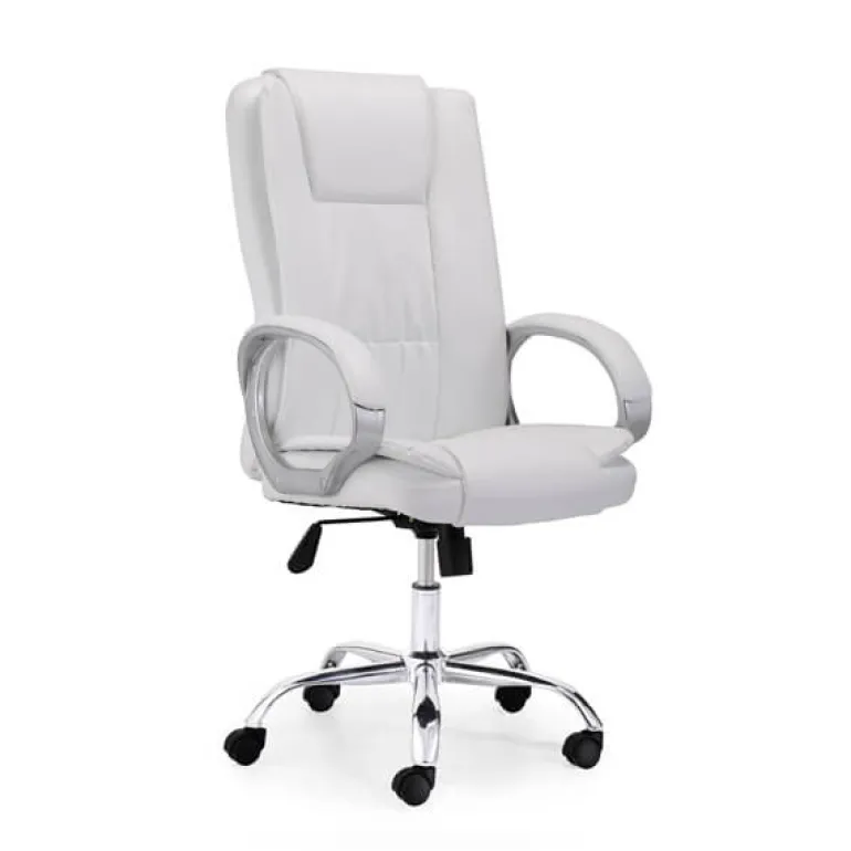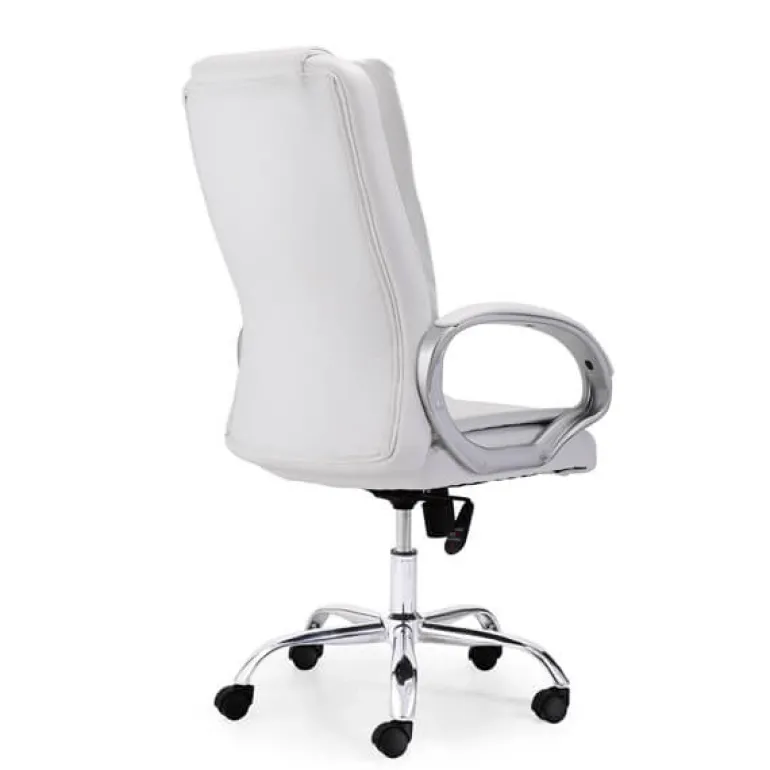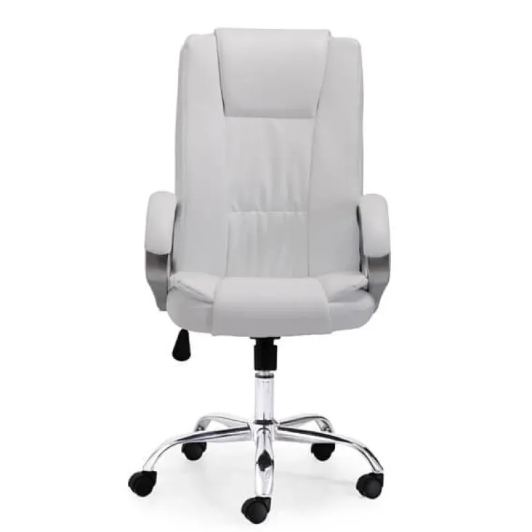 Sillón para despacho blanco muy cómodo, estructura forjadoy giratorio así como regulable en altura con mecanismo basculante, tapizado en simil piel incluidos los respaldos. La elegancia hecha práctica, ademásde serergonómico y muy cómodo.