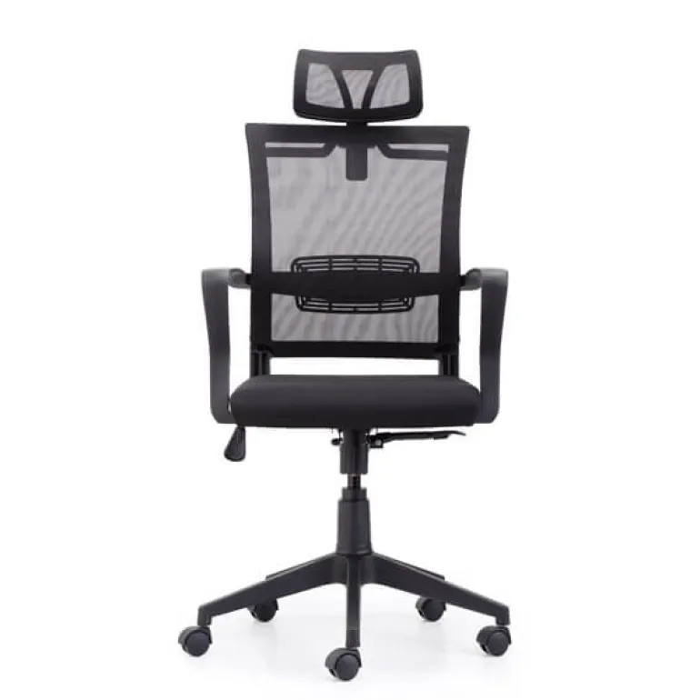 Sillade escritorio muy cómoda, con ruedas y giratorio así como regulable en altura con mecanismo basculante, con cabecero para el apoyo cervical y refuerzo lumbar permitiendo mantener la espalda erguida y cuidada. En tejido de red para una buena transpiración, en color negro. Práctica a la vez que elegante, ergonómica y muy cómoda.