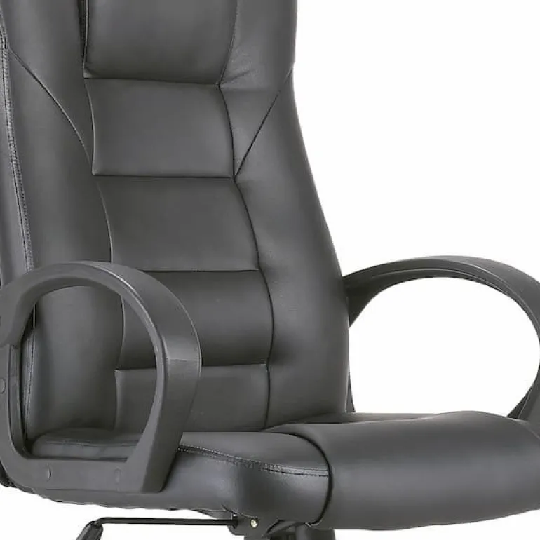Sillón para despacho muy cómodo, con ruedas y giratorio así como regulable en altura con mecanismo basculante, tapizado en simil piel color negro. La elegancia hecha práctica, ademásde serergonómico y muy cómodo.