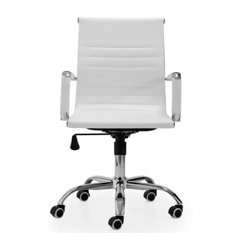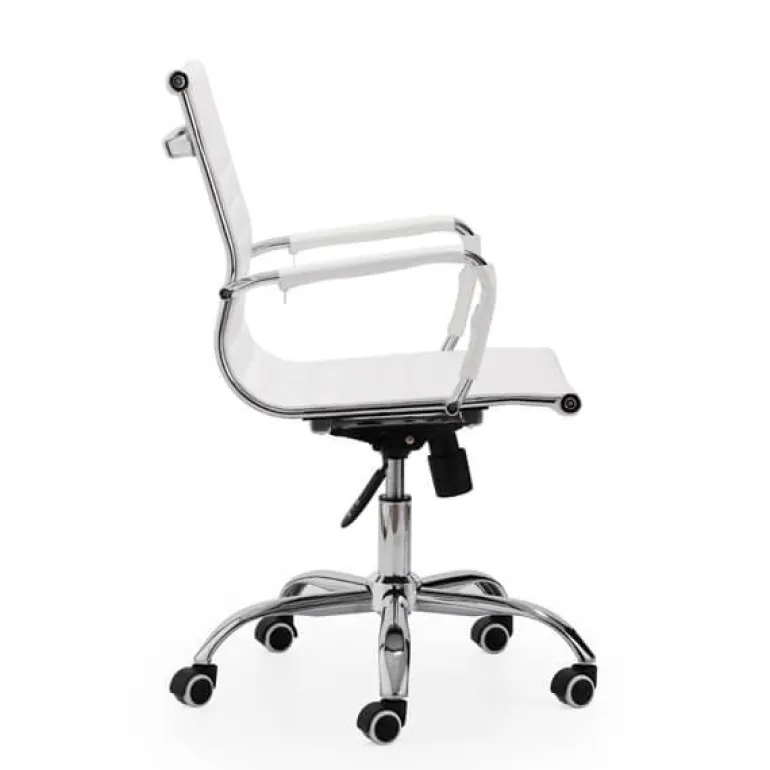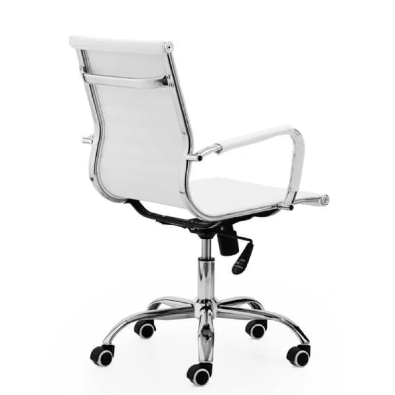 Conseguirás un despacho con mucho estilo con esta silla con mecanismo giratorio y elevable. Con patas cromadas y ruedas aptas para parqué. Además tiene sistema de balanceo y asiento ergonómico. Tapizada en piel sintética blanca.