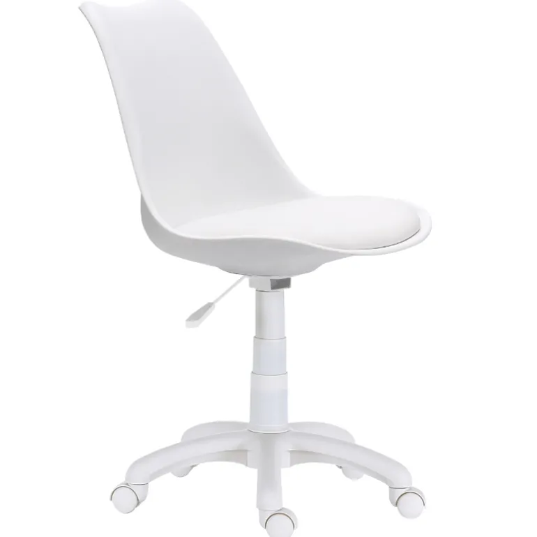 Conseguirás una decoración con mucho estilo con esta silla con mecanismo giratorio y elevable. Con patas Blancas y ruedas aptas para parqué.