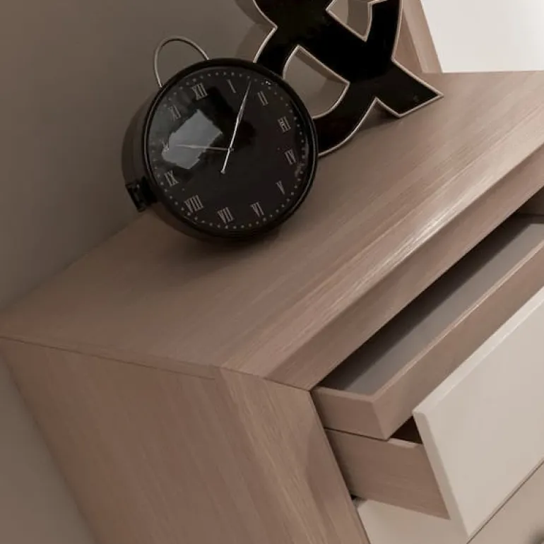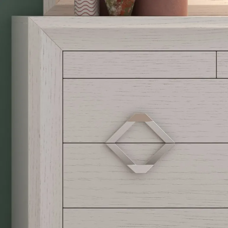 Sinfonier de4 cajones para dormitorio de matrimonio, en chapa de Roble poro abierto blanco, que le otorga un contraste muy elegante,moderno y ligero. Incluye2 cajones pequeños de pulsador push adicionales, con posibilidad de escogerlo sin los cajones pequeños, o con1 cajón interior.
