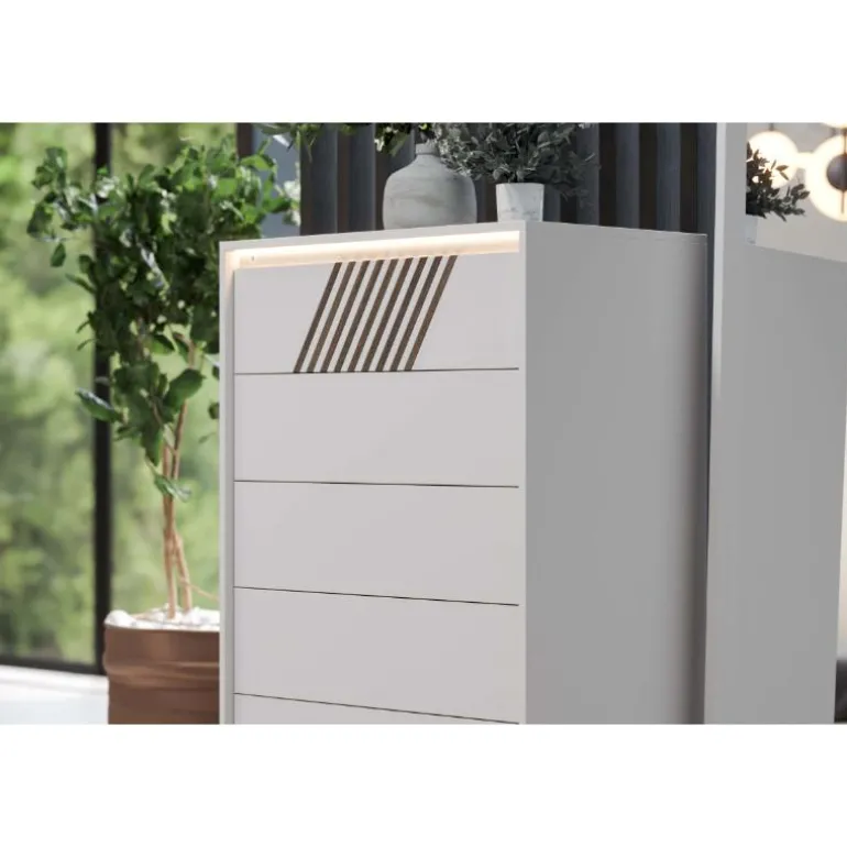 Sinfonier para dormitorio de matrimonio con 6 cajones, acabado Lacado Blanco para el Frente del cajón, y ROBLE N20 el Armazón, con opción de Detalle de láminas paralelas en el cajón superior (Detalle Lacado Grafito), que le otorga un contraste muy moderno y ligero. Perfecto para dormitorios de matrimonio modernos. Con Luces LED indirectas en la parte superior de los cajones. En 2 medidas diferentes a escoger. Con apertura de uñero, ideal para guardar libros, smartphone, etc.