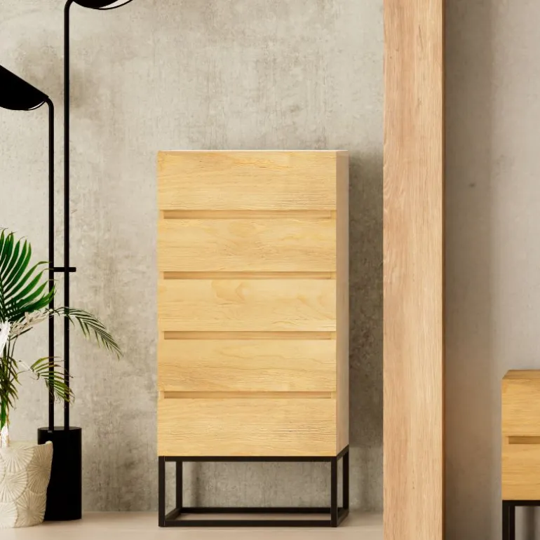 Sinfonier de 5 cajones de fabricación artesanal, con opción de acabado en diferentes maderas del muestrario. Foto en acabado Lacado Blanco y Metal Negro Mate.