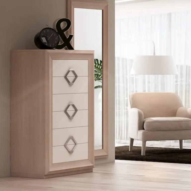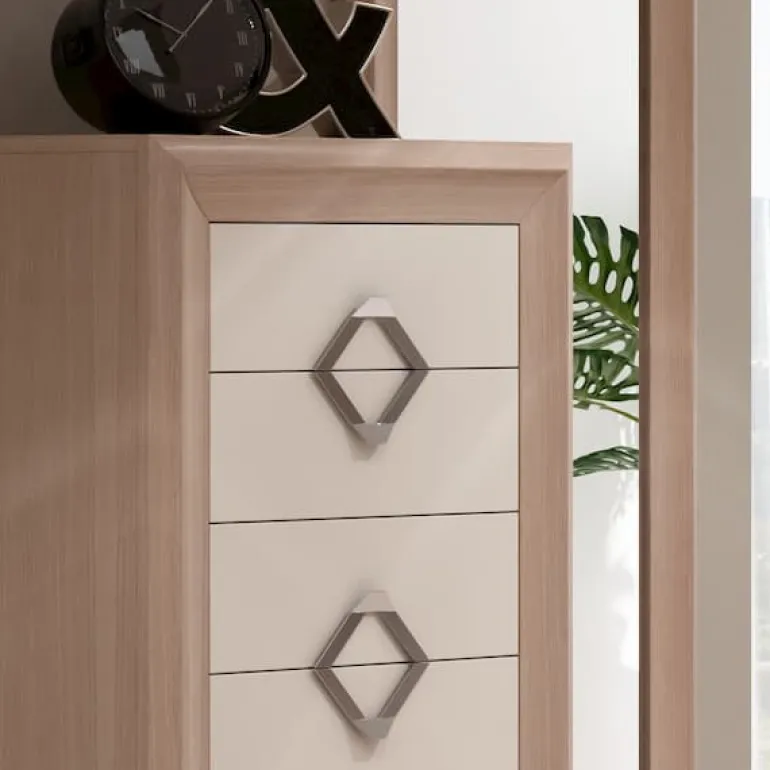 Sinfonier de 6 cajones para dormitorio de matrimonio, en chapa de Roblenatural N20 combinado con cajones en lacado crema, que le otorga un contraste muy elegante,moderno y ligero. Tiene la opción de incluirle un cajón adicional superior pequeño de pulsador push, o un cajón interior.