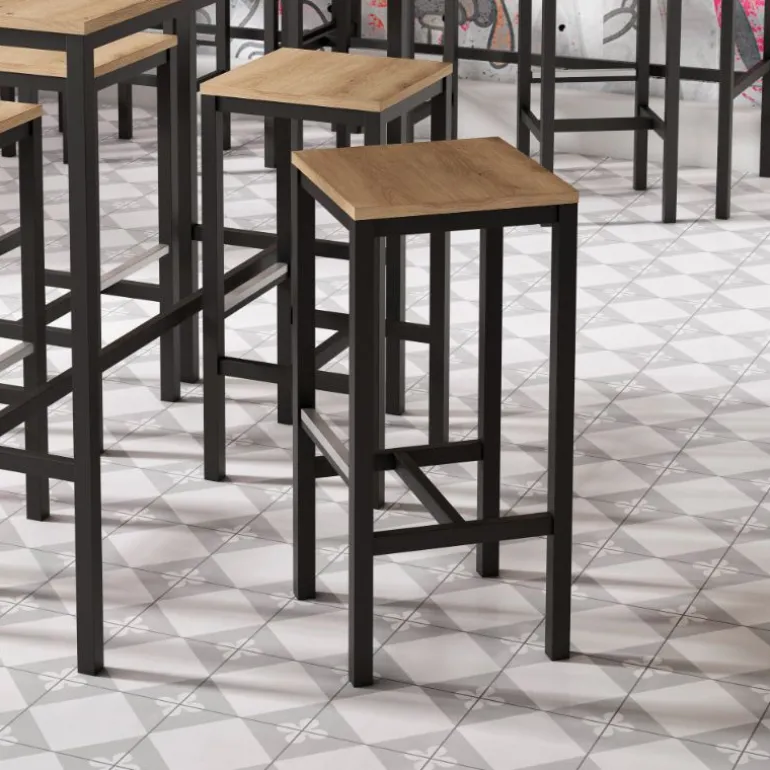 Taburete alto moderno en ecomadera y patas de hierro en acabado metálico. Con opción de respaldo metálico o sin respaldo. En diferentes acabados a escoger entre maderas y metales.