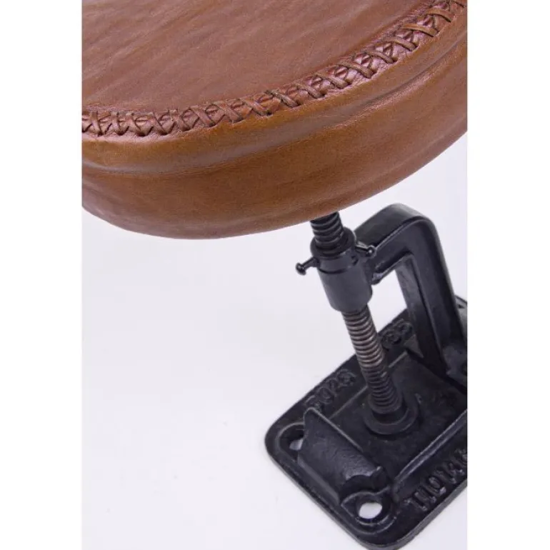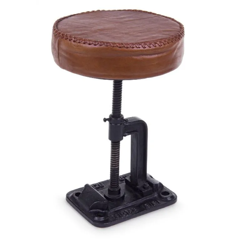 Estructura de hierro y asiento relleno de espuma de poliuretano, y tapizado de piel de búfalo. Altura regulable a rosca.