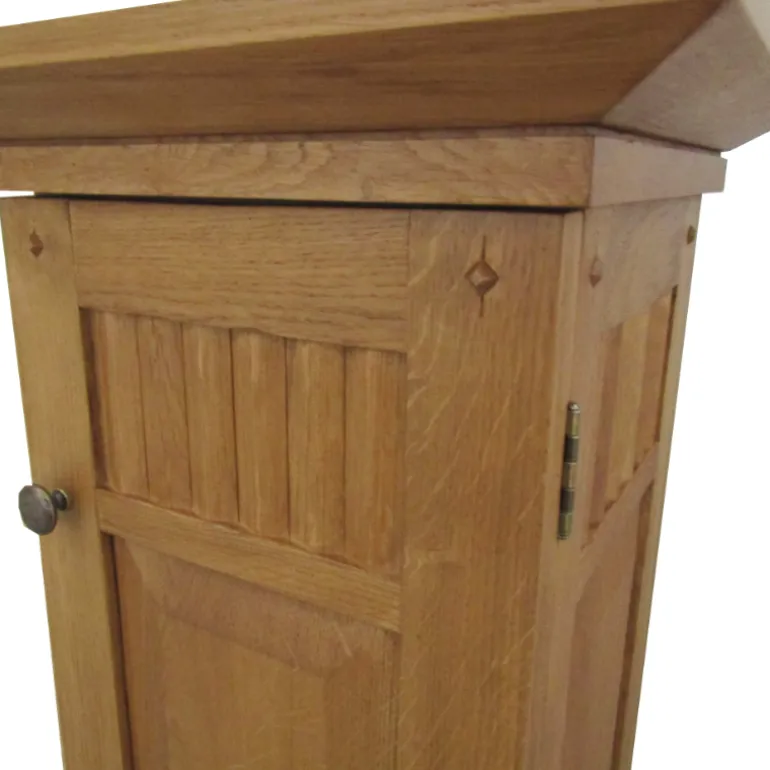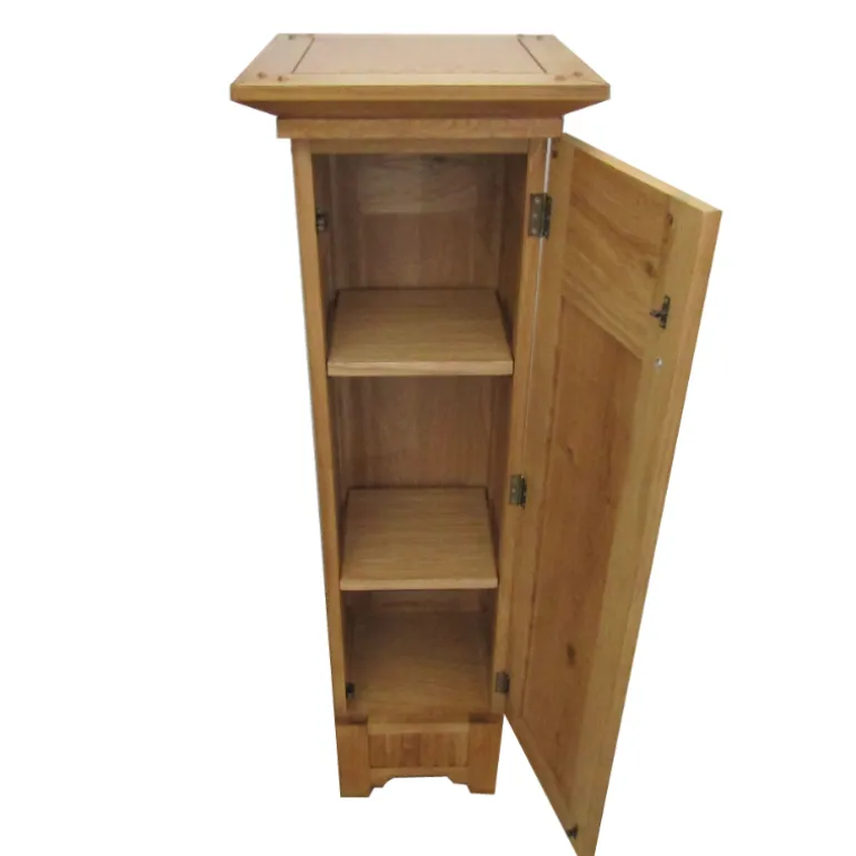 Rústica telefonera alta con puerta, con dos baldas interiores, con detalles tallados en la madera. Para poder almacenar todo aquello que necesites. Esta fabricado en madera de Roble maciza, con acabado natural de tacto fino y tiradores de hierro forjado pulidos.