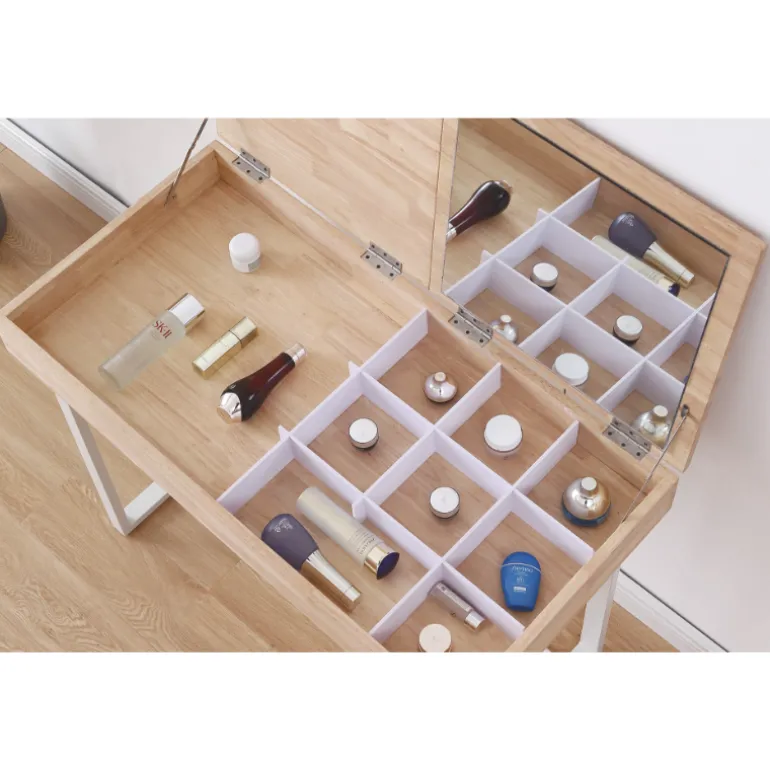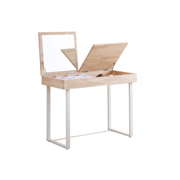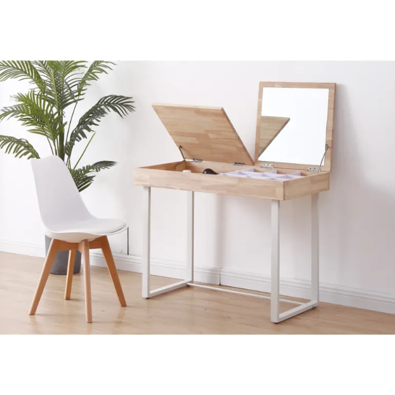 Incluye 2 cajones con tapas abatibles, una de ellas con espejo interior y organizador interno de almacenaje. Cerrado queda cómo una mesa de estudio de Roble.