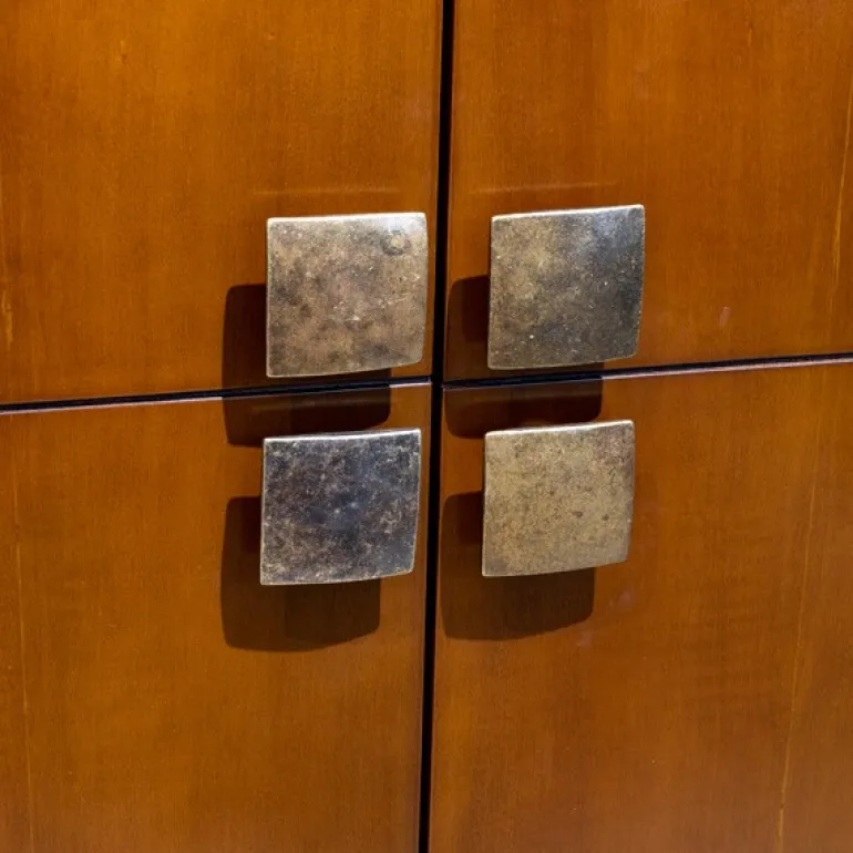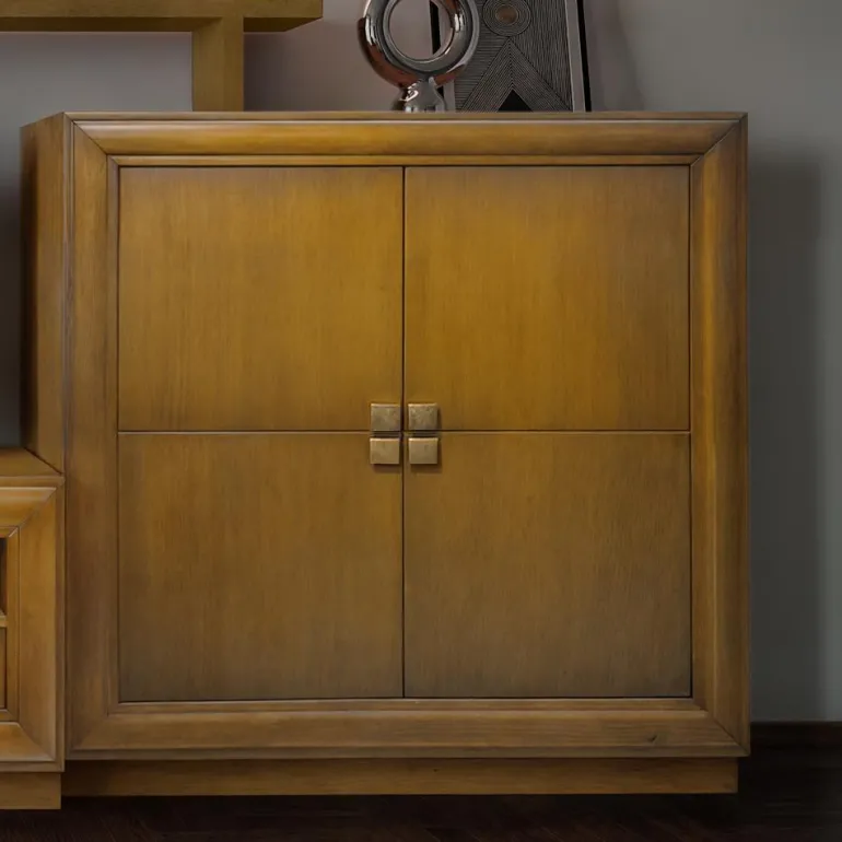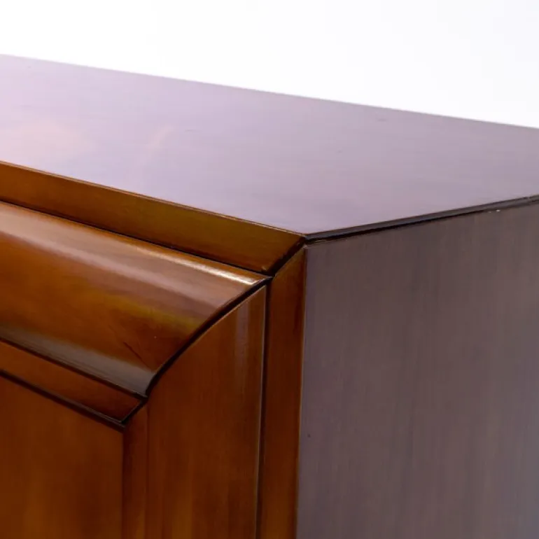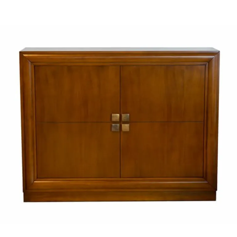 Aparador fabricado en chapa natural Aliso (familia cerezo), acabado tono cerezo suave, tacto espejo y patinado para resaltar sus molduras. Con 4 grandes puertas, para aprovechar al máximo el espacio disponible y tiradores cuadrados en oro envejecido. Dispone de sistema de retención para evitar golpes y alargar la vida del mueble.