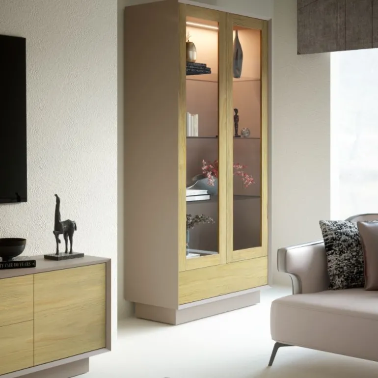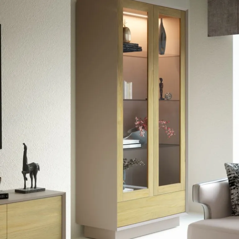 Vitrina de fabricación artesanal, con opción de acabado en diferentes maderas del muestrario. Foto en acabado Lacado Blanco Roto y Madera Roble Francés, con patas de Metal Negro Mate.