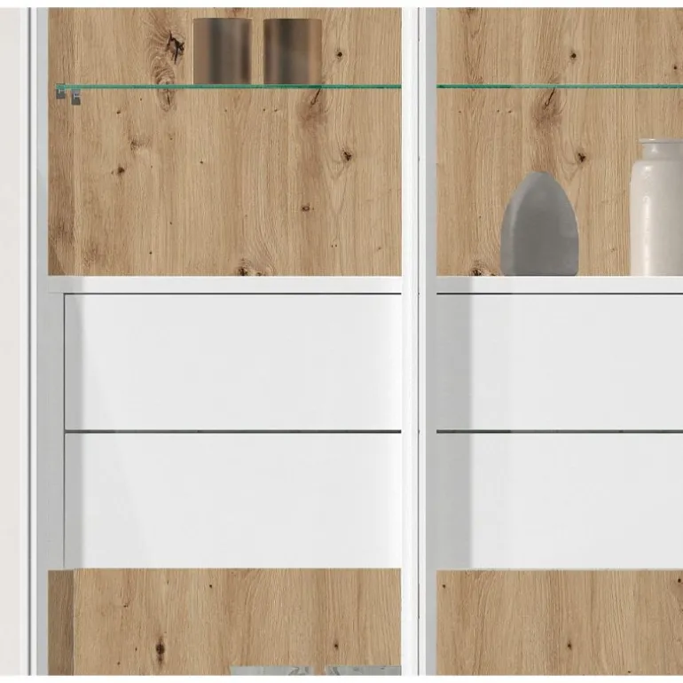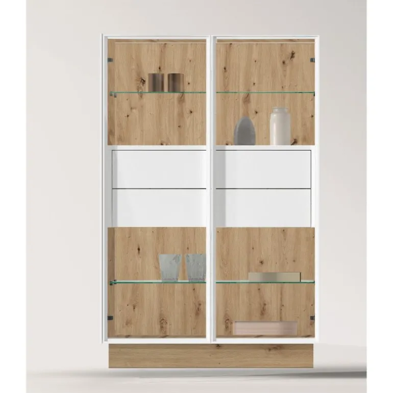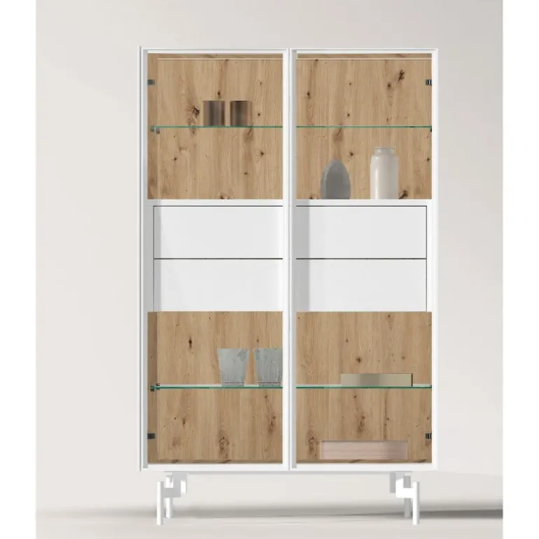 Vitrina Blanca artesano. Estupendo mueble para el salón / comedor que destaca por sus trasera en acabado Roble Artesano y marco puertas de cristal a escoger color banco o grafito, que en éste ejemplo es blanco. Diferente a la mayoría de muebles que podemos ver, vanguardista, recto muy elegante. Compuesto por 2 puertas de cristal y Acabado ecomadera Roble y Laminado Blanco mate. Todo ello con patas metálicas de 16 cm. color Blanco o Grafito (disponible también con zócalo).