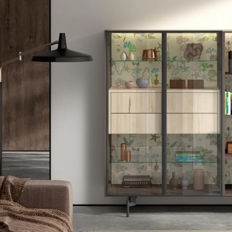 aluminio lacado grafito o blanco Mate, con cristal transparente (estantes interiores