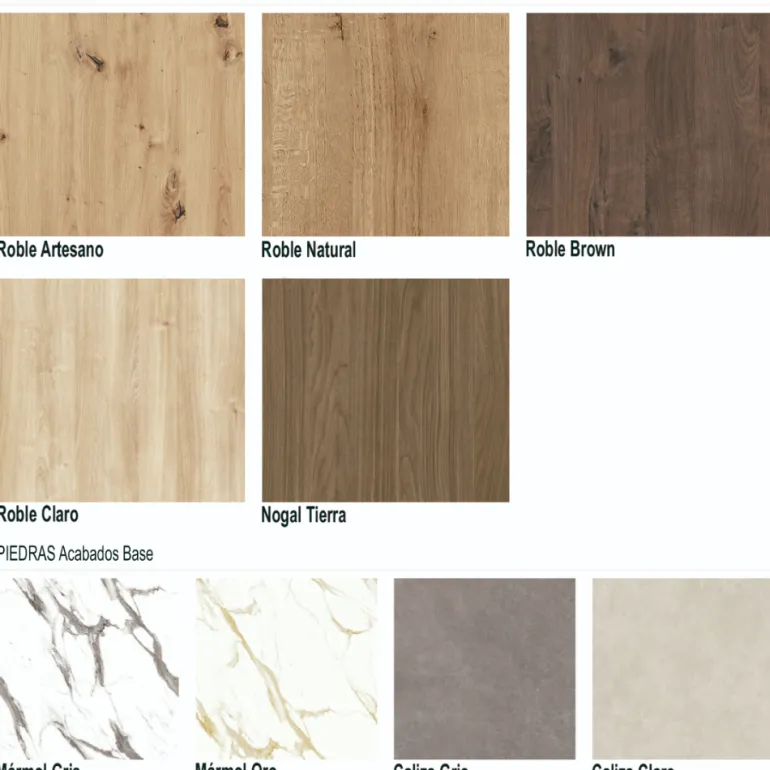 | Acabado Puerta/Cajón | Bambú, Basalto, Beige, Blanco Seda, Gris Pizarra, Mármol Gris, Mármol Oro, Roble Artesano, Roble Brown, Roble Natural, Terracota, Verde Jungla, Caliza Claro, Caliza Gris, Nogal Tierra, Roble Claro |
