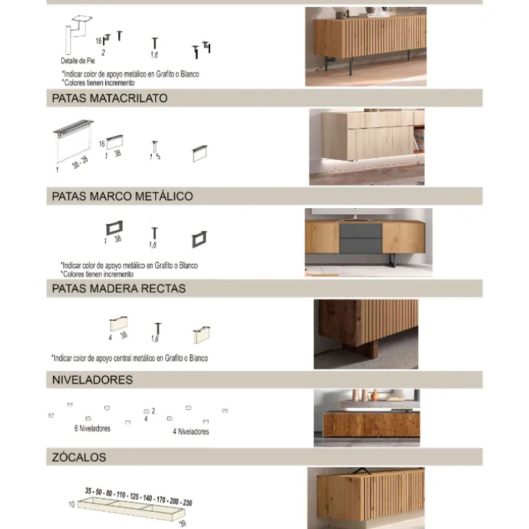 | Apoyo | Niveladores, Pata Metacrilato, Patas metálicas Blancas, Patas metálicas Grafito, Zócalo |