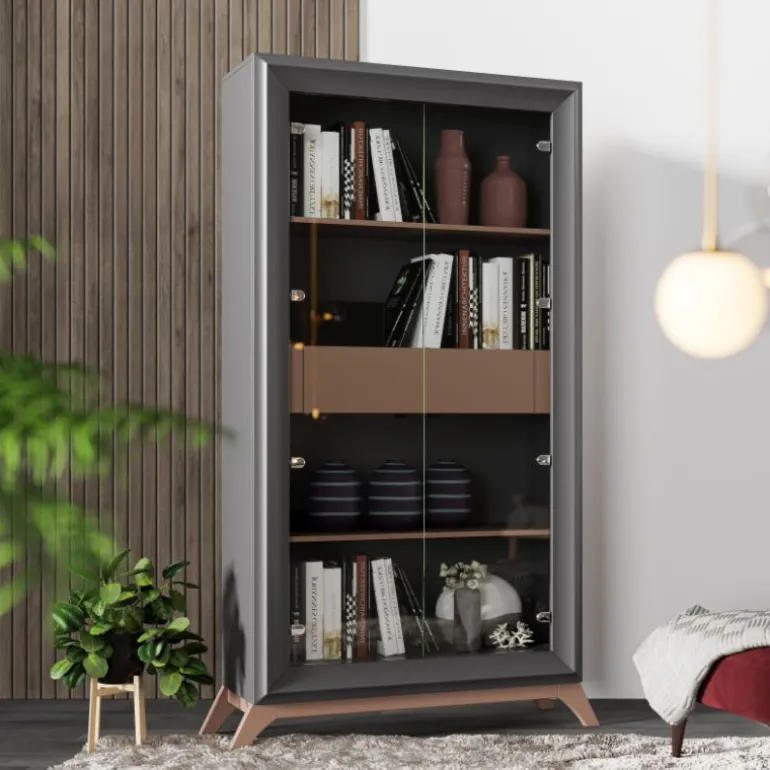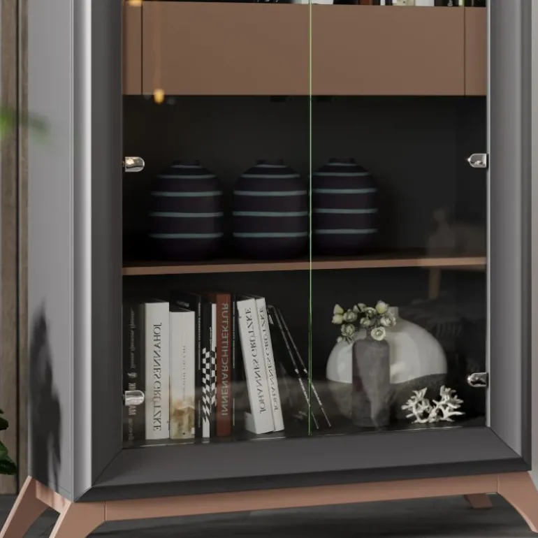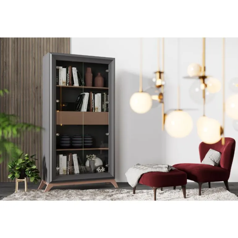 Vitrina para salón o comedor compuesta por 2 puertas de cristal y un cajón interior a media altura, con un marco de estilo contemporáneo que combina muy bien con cualquier estilo, y patas de madera que se puede sustituir por zócalo. Fabricada en acabado Lacado Grafito de calidad, con los frentes del cajón, baldas y las patas en Lacado Nº60, que combinan a la perfección. Y si le sumamos la preciosa vitrina de cristal con el interior del mismo acabado, nos aporta mucho más espacio de almacenaje para que puedas tener todo organizado.