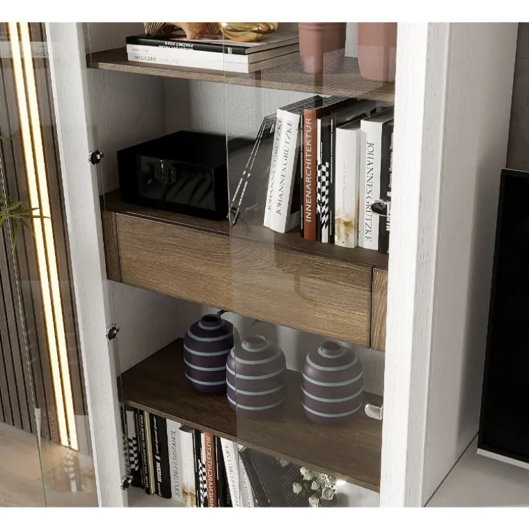 •Vitrina fabricada en Acabado Lacado con opción de a poro abierto para poder sentir y ver el relieve de la veta, y Roble Natural.