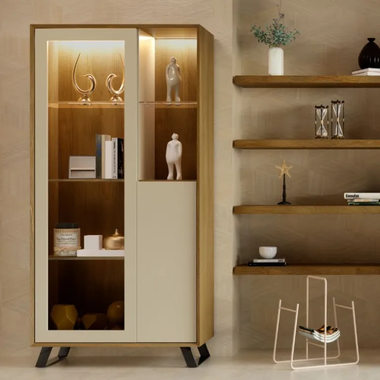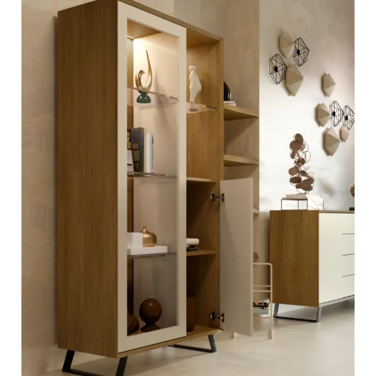 Vitrina de fabricación artesanal, con opción de acabado en diferentes maderas del muestrario. Foto en acabado Lacado Blanco Roto y Madera Roble Francés, con patas de Metal Negro Mate.